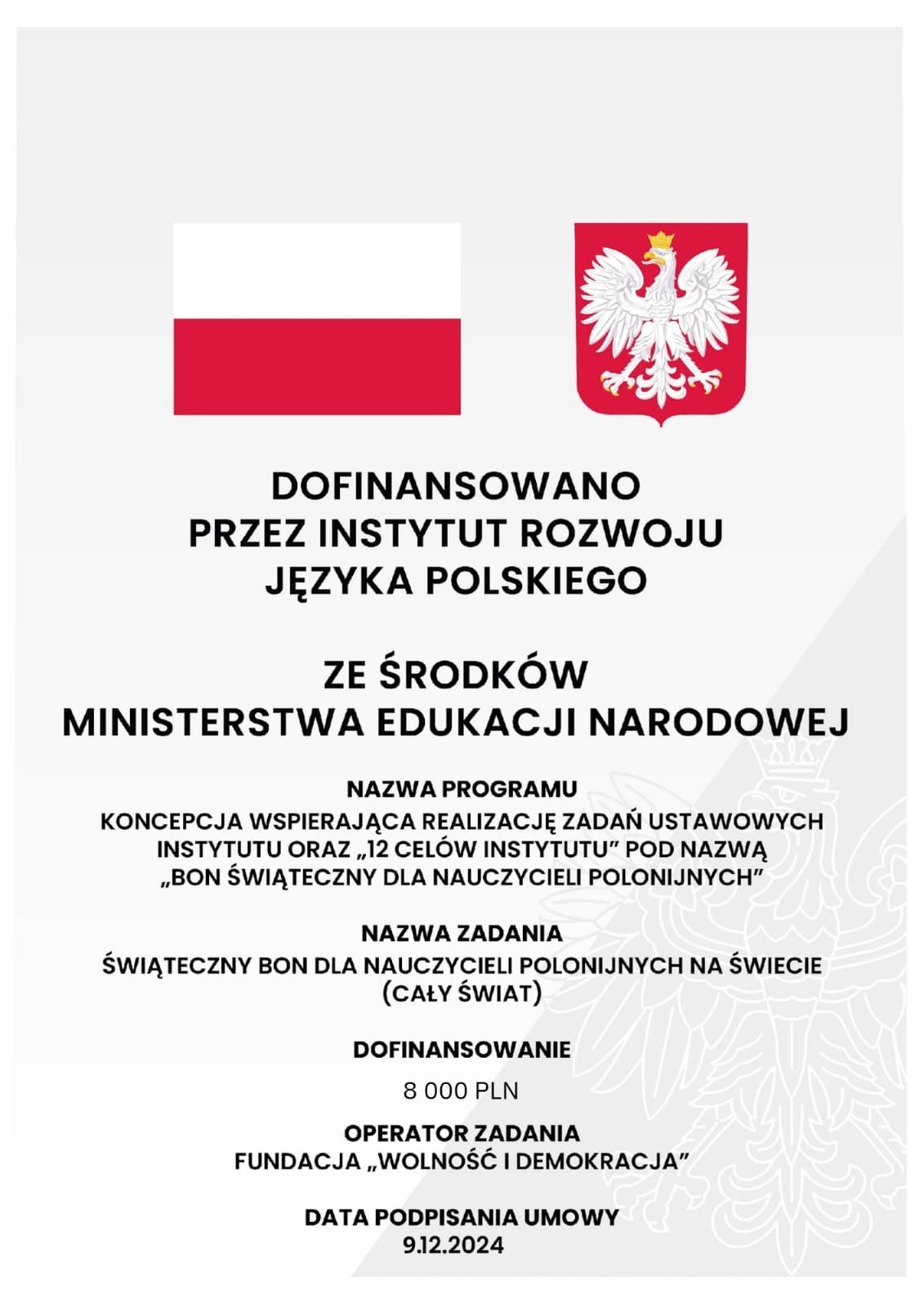 Informujemy, że nasza organizacja otrzymała za pośrednictwem Stowarzyszenia "Wspólnota Polska" dofinansowanie od Instytutu Rozwoju Języka Polskiego im. Św. Maksymiliana Marii Kolbego ze środków Ministra Edukacji Narodowej w ramach konkursu "Wsparcie nauczania języka polskiego za granicą poprzez dofinansowanie zakupu podręczników, sprzętu biurowego, sprzętu komputerowego oraz oprogramowania"