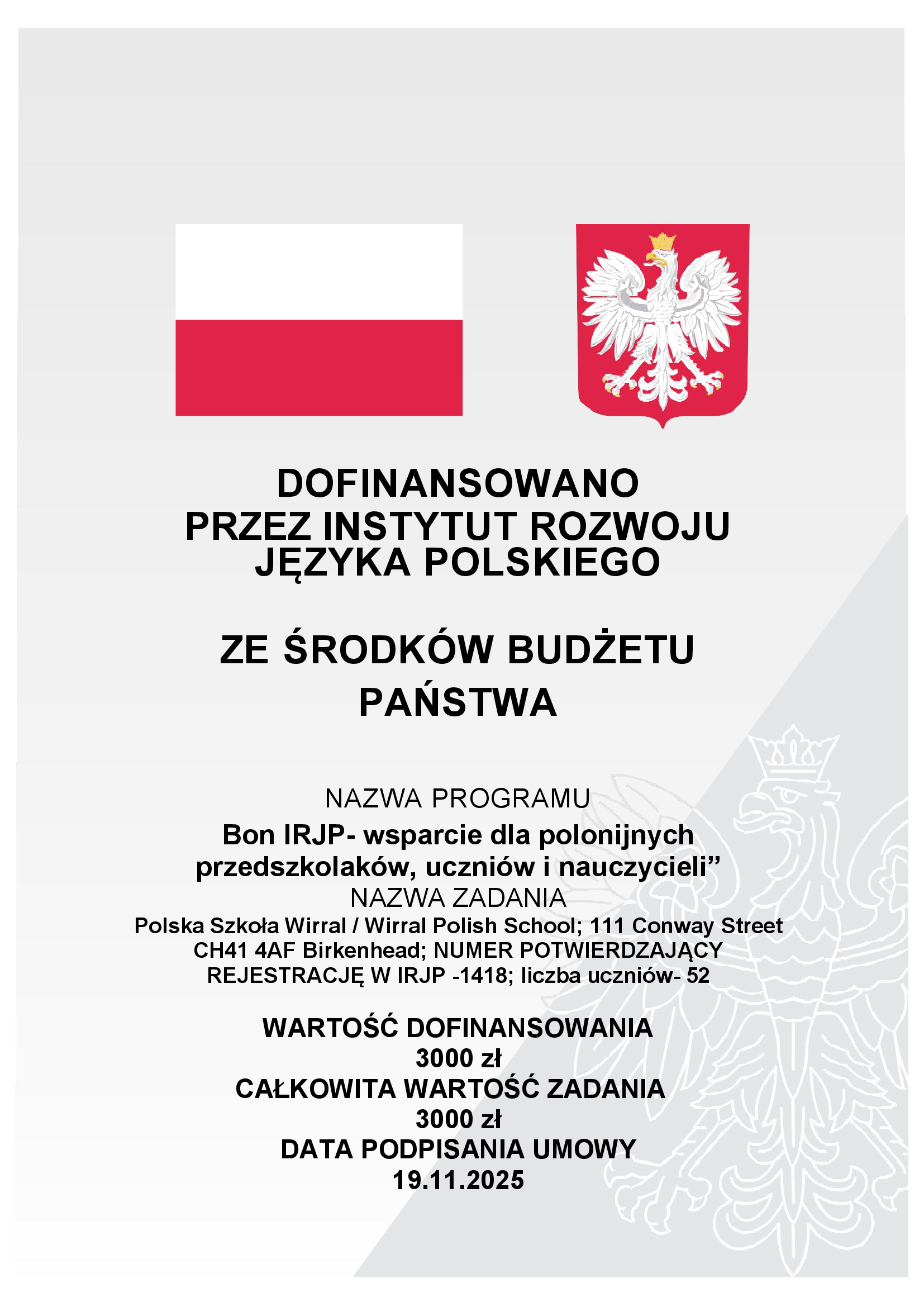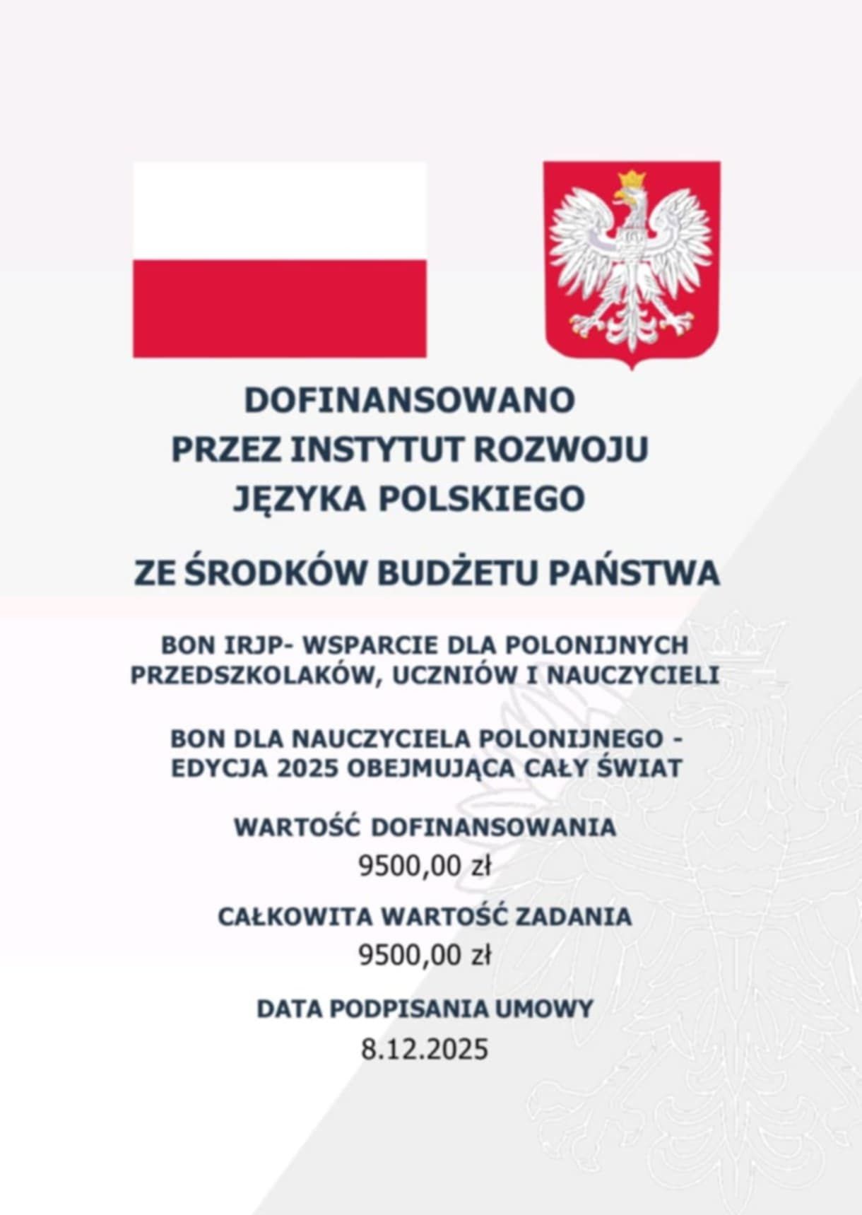 Informujemy, że nasza organizacja otrzymała za pośrednictwem Stowarzyszenia "Wspólnota Polska" dofinansowanie od Instytutu Rozwoju Języka Polskiego im. Św. Maksymiliana Marii Kolbego ze środków Ministra Edukacji Narodowej w ramach konkursu "Wsparcie nauczania języka polskiego za granicą poprzez dofinansowanie zakupu podręczników, sprzętu biurowego, sprzętu komputerowego oraz oprogramowania"